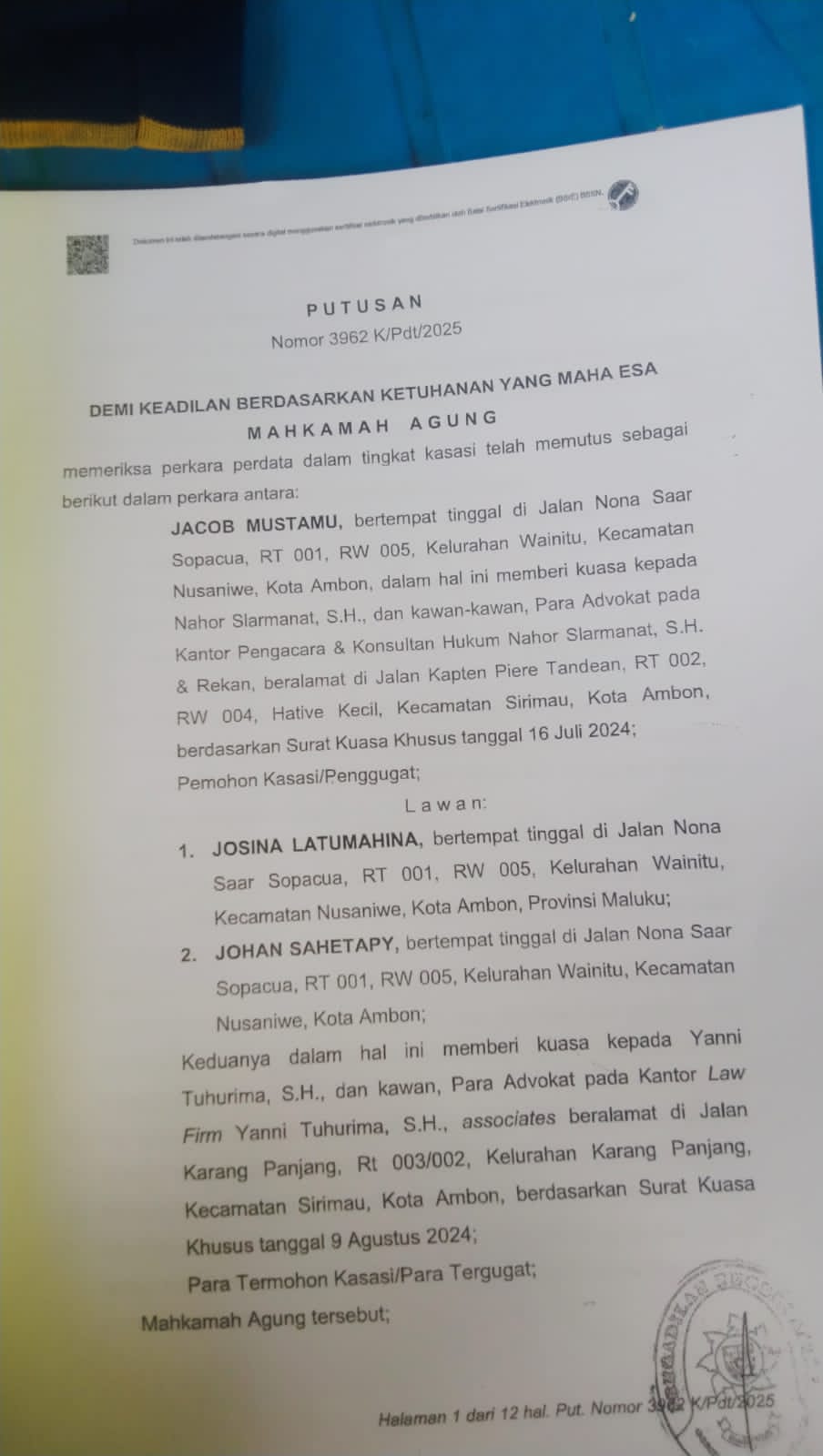 Nomor 3962 K / Pdt / 2025 dikeluarkan oleh Mahkamah Agung dalam rangka mengabulkan kasasi penggugat Jacob Mustamu atas sengketa dimaksud.